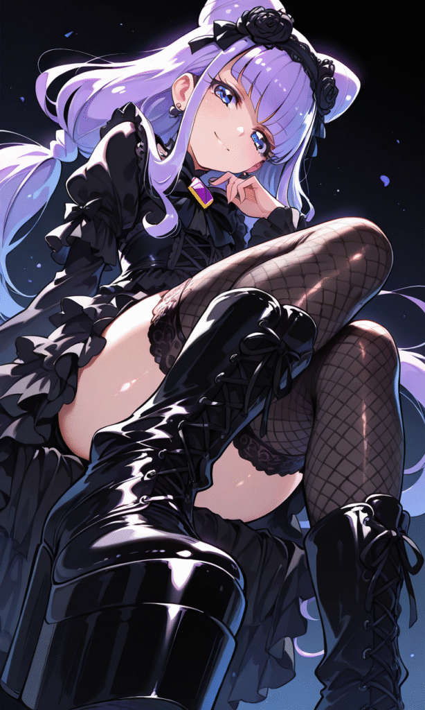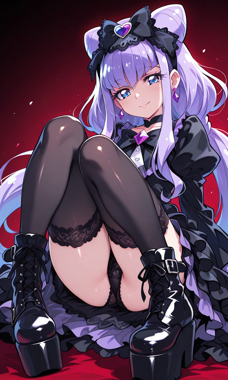 PixAI【Shiitake-Mix】ruru amour(precure), smile,gothic lolita,platform boots,black lace thighhighs,panty shot,black lace panties, masterpiece,high quality,shiny skin, shiny,tokiame