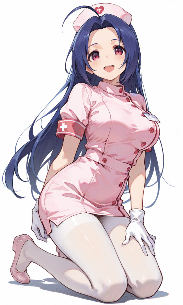PixAI【Shiitake-Mix】miura azusa,long hair, smile,open mouth,pink nurse,white pantyhose,white glove,kneeling,looking at viewer,cowboy shot, simplebackground,white background, masterpiece,high quality,tokiame,[artist: deal360acv]