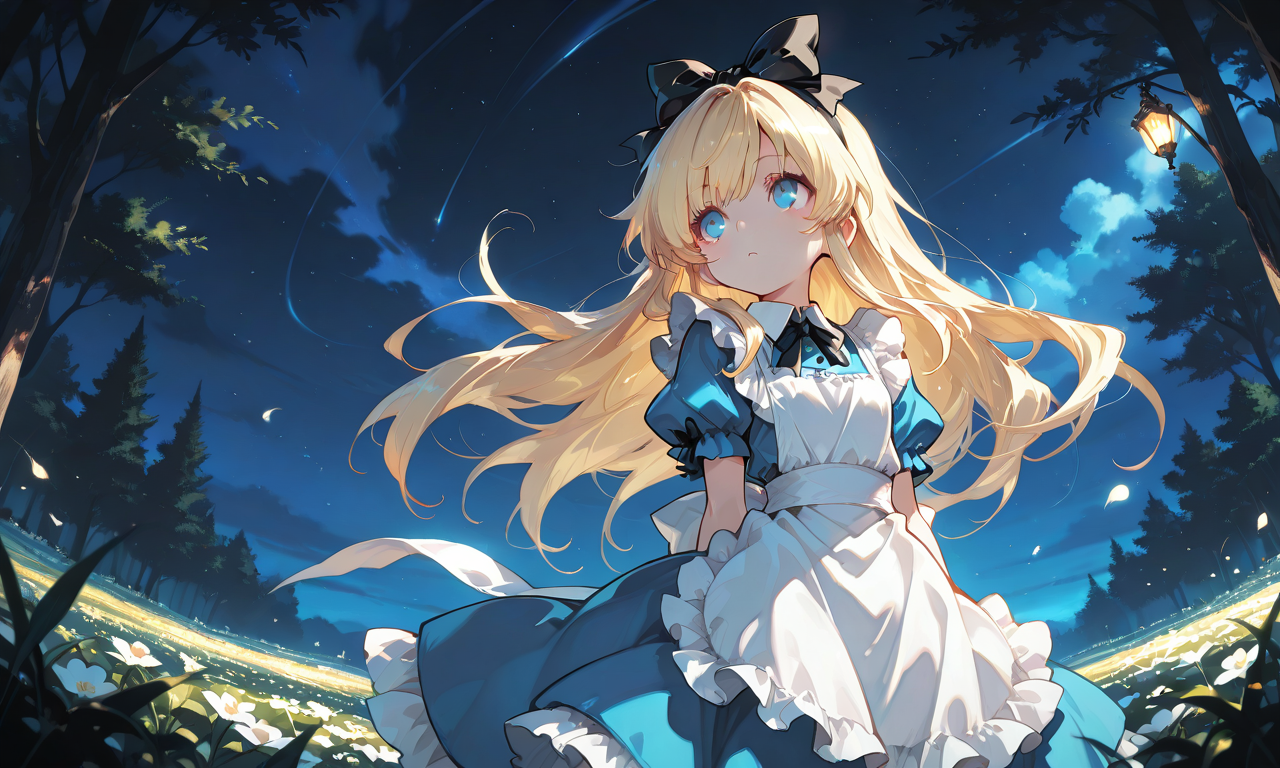PixAI【Shiitake-Mix】Alice’s Adventures in Wonderland,little girl,loli,8 year old,blond hair,long hair,night sky,look up,cowboy shot,masterpiece,high quality, high resolution
