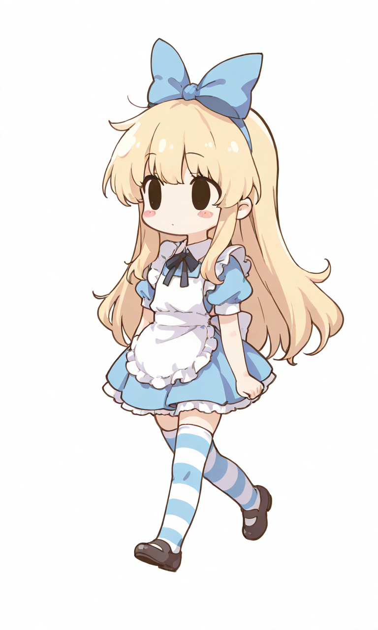 ((chibi)),Alice’s Adventures in Wonderland,little girl,loli,solo,blond hair,long hair,full body,blue striped thighhighs, walking, blush stickers,solid oval eyes,chibi,masterpiece,high quality, simplebackground,white background,Anime, moe,tokiame