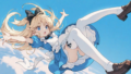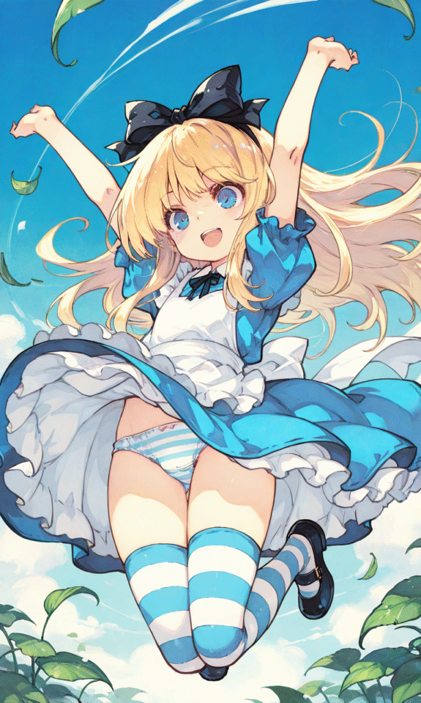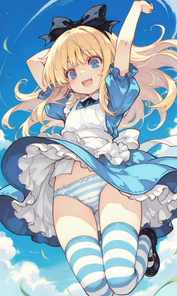 Alice’s Adventures in Wonderland,little girl,blond hair,long hair,smile,open mouth, dress,striped panties,panty shot,wind lift,blue striped thighhighs,arms up,jumping, blue sky,from below, masterpiece,high quality, ,tokiame,748cmstyle