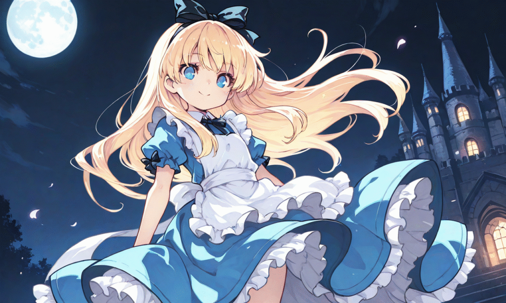 Alice’s Adventures in Wonderland,little girl,loli,solo,blond hair,long hair,cowboy shot,moon night,castle,smile,wind lift, masterpiece,high quality, ,tokiame,cinematic lighting , cinematic angle, soft light , color detail, backlighting, Depth of field, long exposure, light steps, intricate colors, vibrant colors,