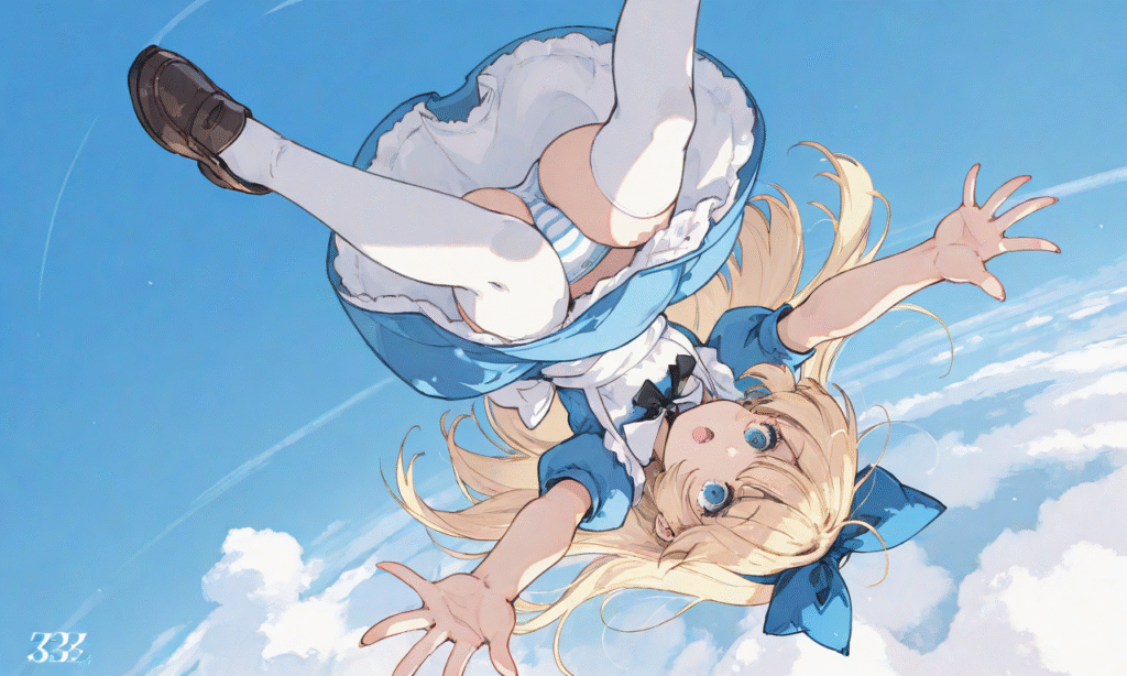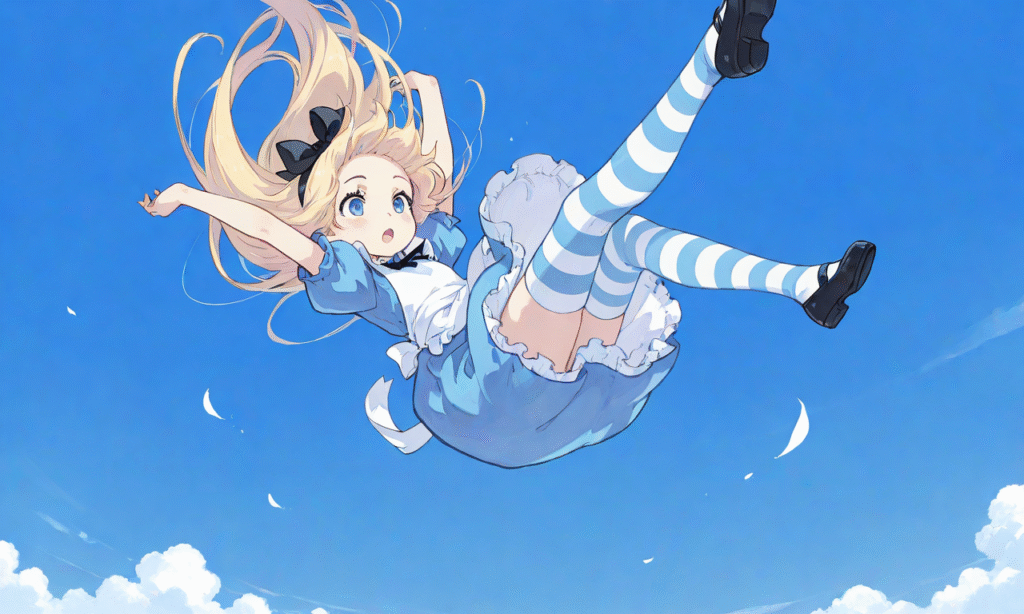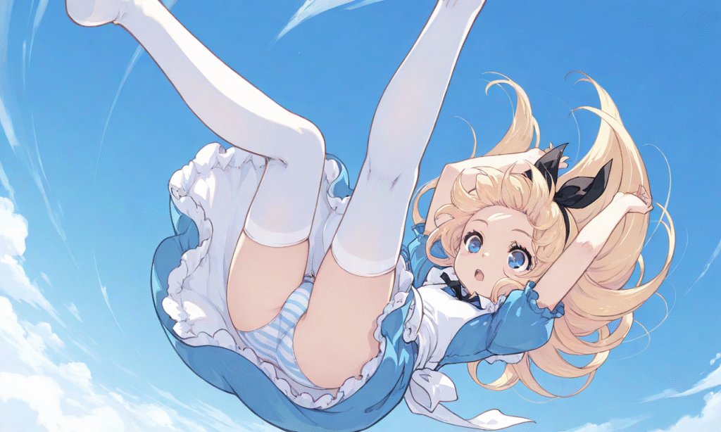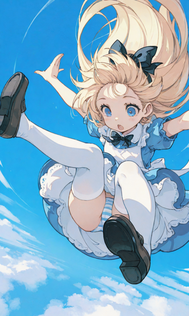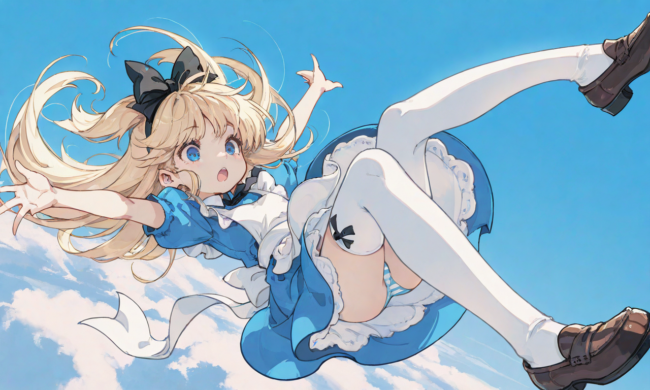 PixAI【Shiitake-Mix】Alice’s Adventures in Wonderland,little girl,blond hair,long hair,open mouth, dress,white thighhighs,blue sky,midair,flegs over head,falling,from above,panty shot,striped panties, masterpiece,high quality, outstretched arms,loafers ,tokiame,z3zz4