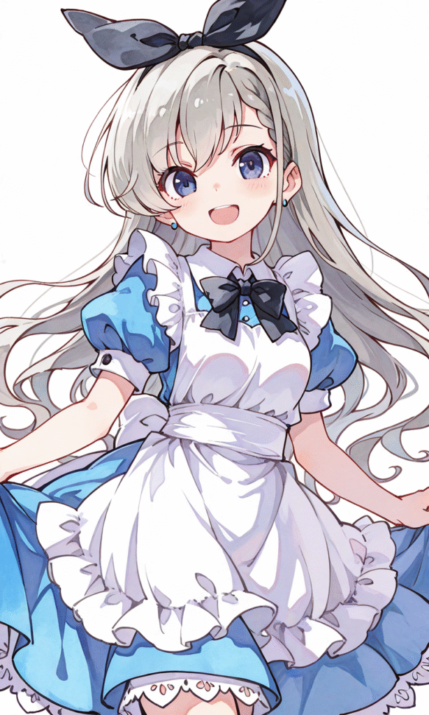 hisakawa hayate,solo, (alice in wonderland) (cosplay), smile,open mouth, cowboy shot,simplebackground,white background, masterpiece,high quality, high resolution,tokiame,watercolor
