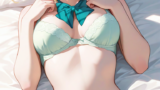 PixAI【Neverland】1girl, solo,black hair,medium hair,straight hair,brown eyes,black glasses,blush,white t-shirt,bottomless,sitting,bed