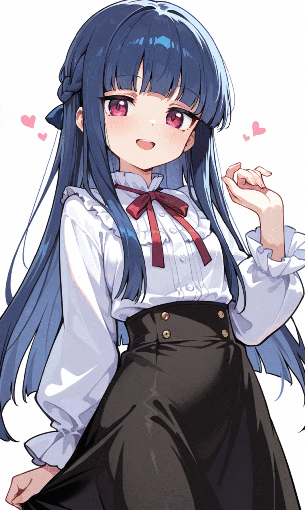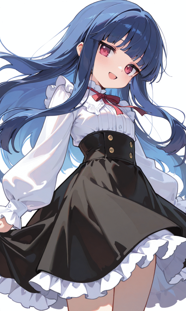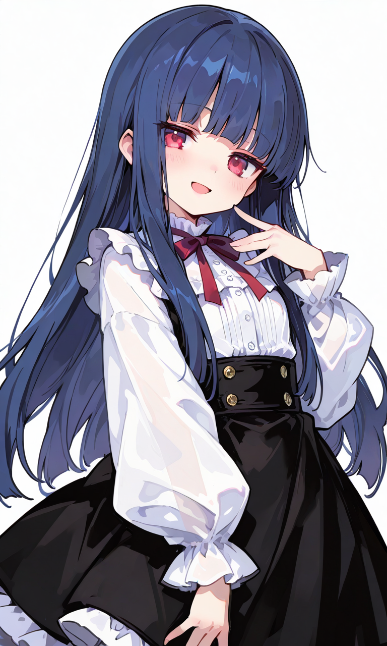 PixAI【Shiitake-Mix】sajo yukimi,blouse, red neckribbon,black high waist skirt, smile,open mouth, cowboy shot,simplebackground,white background, masterpiece,high quality, high resolution