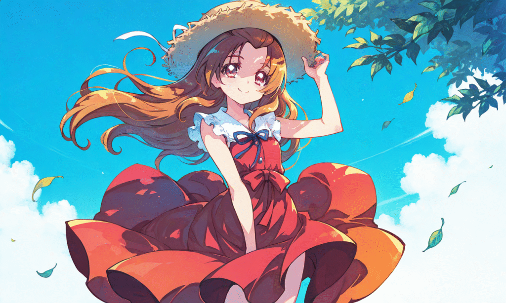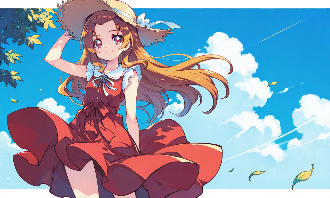 PixAI【Shiitake-Mix】madoka aguri(precure),smile, red sundress,sleeveless,white collar,neck ribbon,straw hat,wind lift, leaf,summer,blue sky, cowboy shot,,tokiame,colorful, soft shading, soft blending, detailed, a