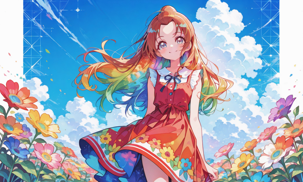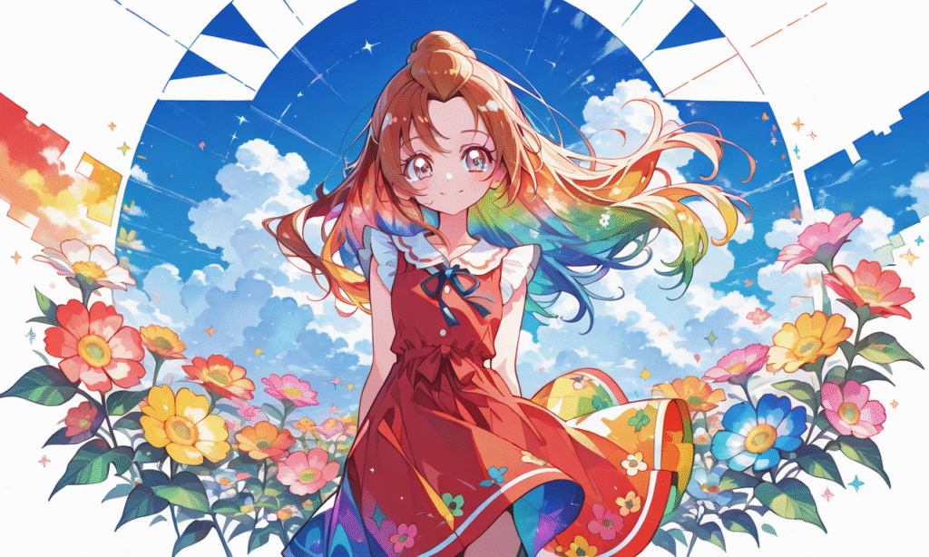 madoka aguri(precure),smile, red sundress,sleeveless,white collar,neck ribbon,wind lift, leaf,summer,blue sky, cowboy shot,colorful, soft shading, soft blending, detailed,minimalistic line logo, tessellated geometrical design, symmetrical, vectorized, white background, digital style,colored pencil, colorful flowers,((4k,8k,Ultra HD)),((Masterpiece :1.2)),((Best quality :1.2)),((Detailed :1.5)),((Detailed background :1.5))