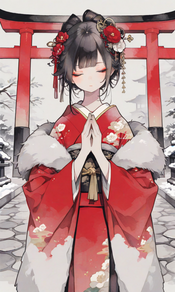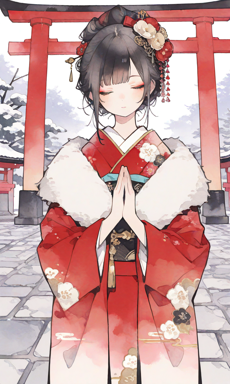 PixAI【Shiitake-Mix】1girl, black hair, hair up, kanzashi, red kimono, fur shawl, cowboy shot,straight-on, torii, closed eyes, Put your palms together,masterpiece,high quality, winter,cobblestone, high-res,(watercolor_(medium):1.2)(simple coloring,flat color:2)dutch angle,748cmstyle