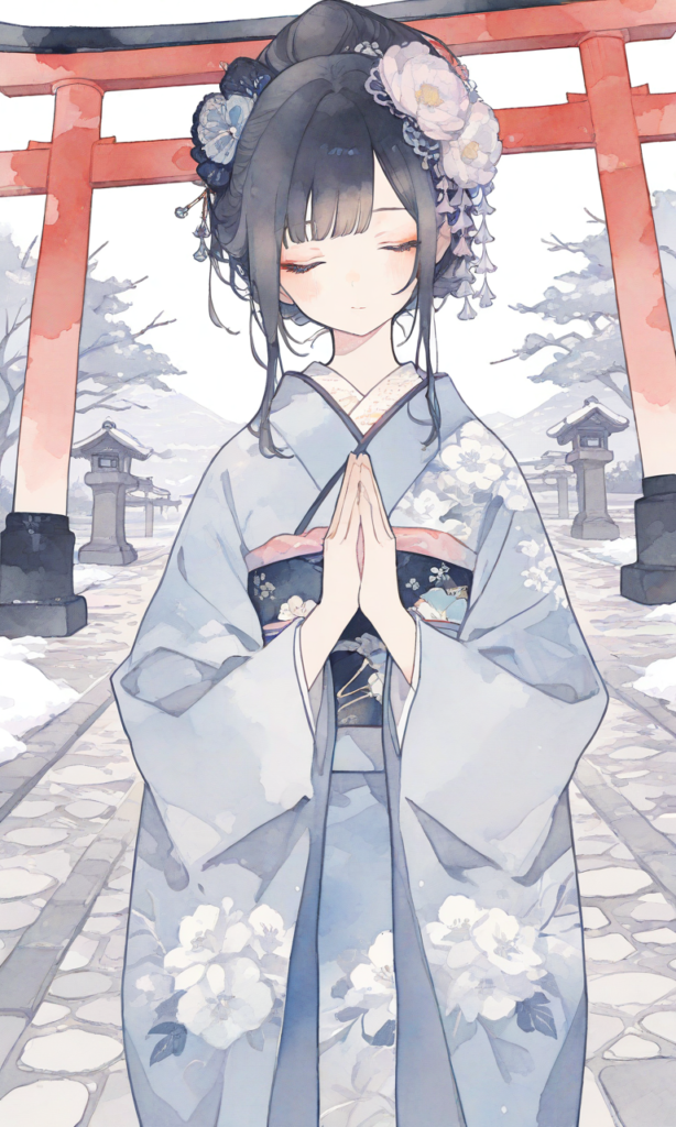 1girl, black hair, hair up, kanzashi, kimono, cowboy shot,straight-on, torii, closed eyes, Put your palms together,masterpiece,high quality, winter,cobblestone, high-res,(watercolor_(medium):1.2)(simple coloring,flat color:2)dutch angle,748cmstyle