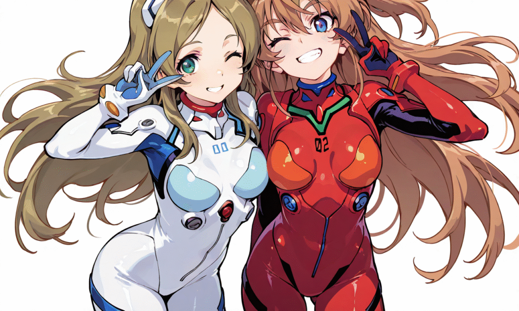 PixAI【Shiitake-Mix】2girls, houjou hibiki(red plugsuit), minamino kanade(white plugsuit), smile, grin, v, one eye closed, shoulder-to-shoulder, cowboy shot, simple background, white background, masterpiece, high quality, shiny skin, shiny, tokiame