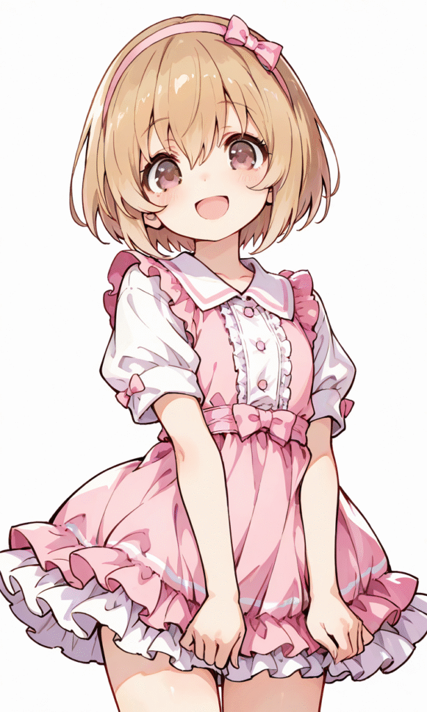 PixAI【Shiitake-Mix】koga koharu,solo, smile,open mouth,tareme,big eyes,pink frilled dress,short sleeves, miniskirt,hairband, looking at viewer, cowboy shot,simplebackground,white background, masterpiece,high quality, high resolution