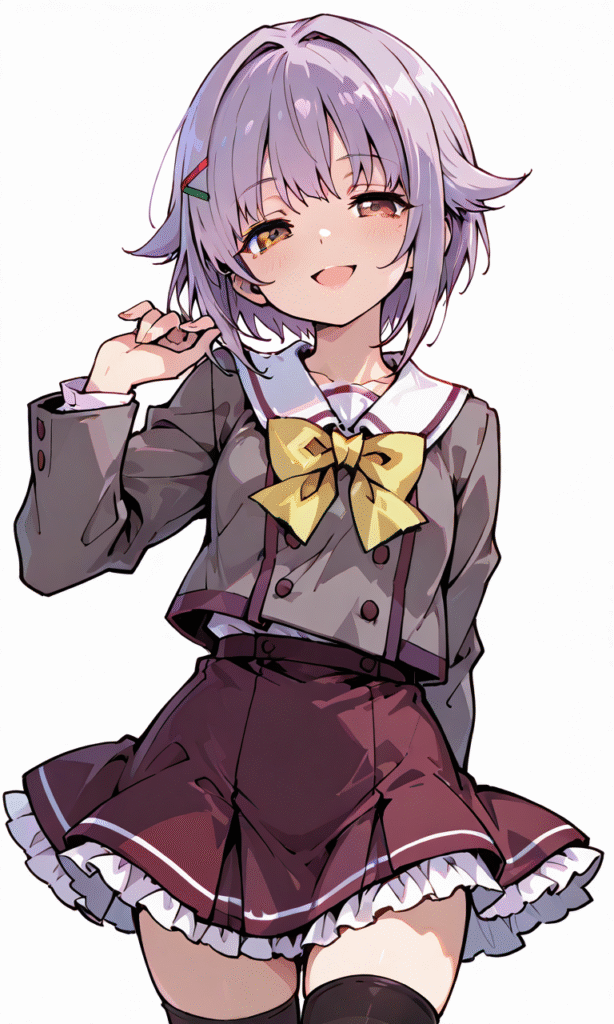 koshimizu sachiko,smile,open mouth, school uniform,black thighhighs,cowboy shot,simplebackground,white background, masterpiece,high quality, high resolution