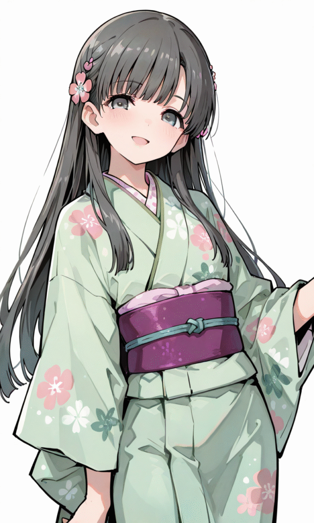 kobayakawa sae, smile,open mouth,light green kimono, cowboy shot,simplebackground,white background, masterpiece,high quality, high resolution