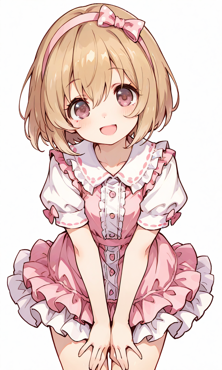 PixAI【Shiitake-Mix】koga koharu,solo, smile,open mouth,tareme,big eyes,pink frilled dress,short sleeves, miniskirt,hairband, looking at viewer, cowboy shot,simplebackground,white background, masterpiece,high quality, high resolution