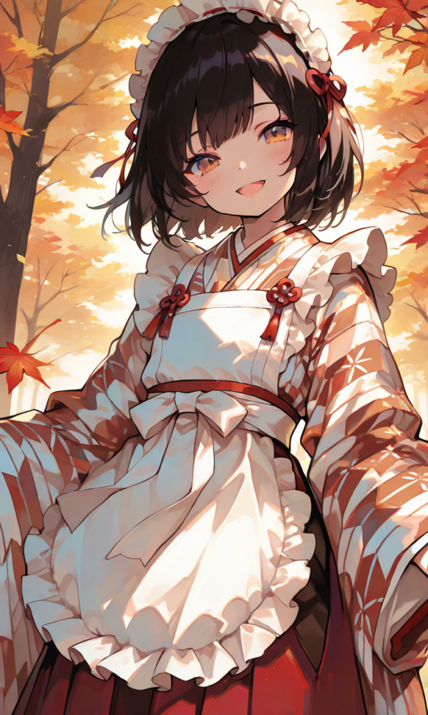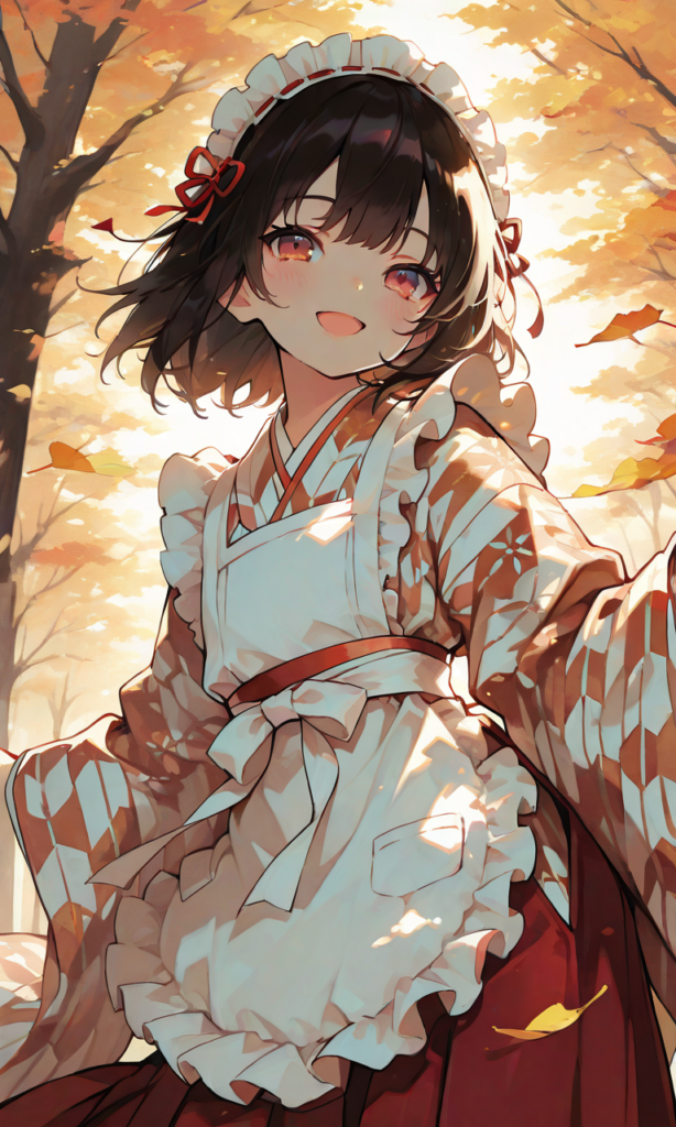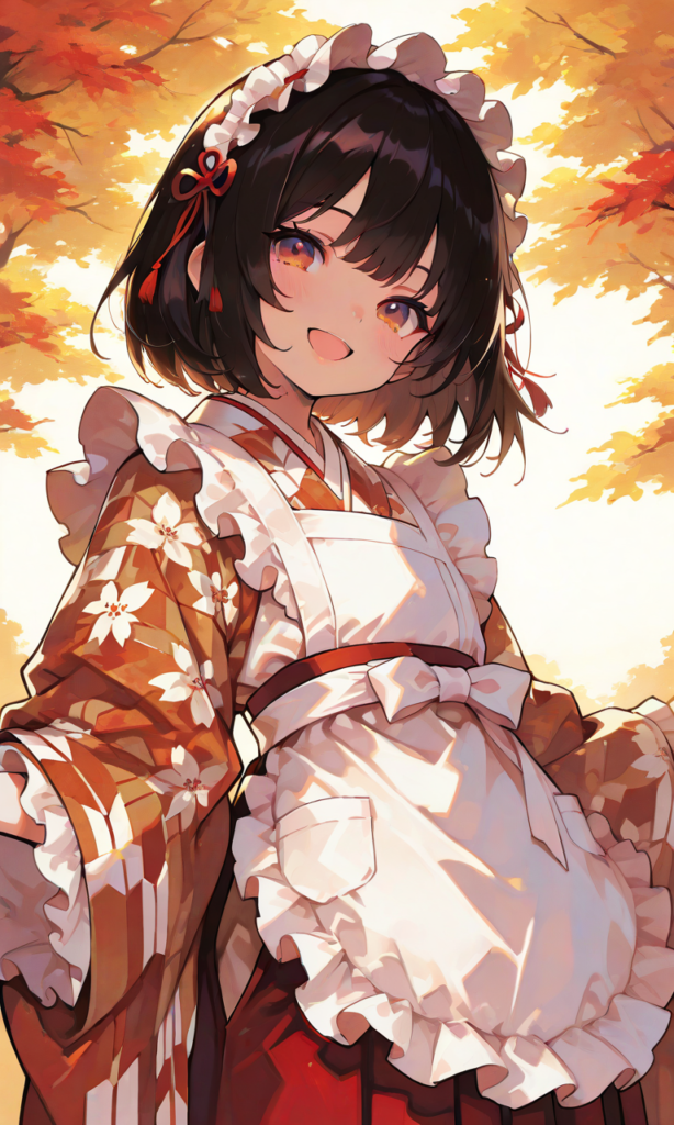 PixAI【Shiitake-Mix】1girl, little girl, black hair, short hair, traditional japanese outfit, modern essence, red hakama, brown hakama, yagasuri-pattern kimono, white frilled apron, white frilled headband, smile, open mouth, cowboy shot, simple background, autumn, masterpiece, high quality, high resolution, hyper-detailed, high contrast, depth of field, ray tracing, best lighting, cinematic composition, beautiful face, beautiful eyes, sharp focus, (masterpiece:1.2), (best quality:1.2), (very aesthetic:1.2), (absurdres:1.2), (detailed background), neon pop art style, 748cmstyle