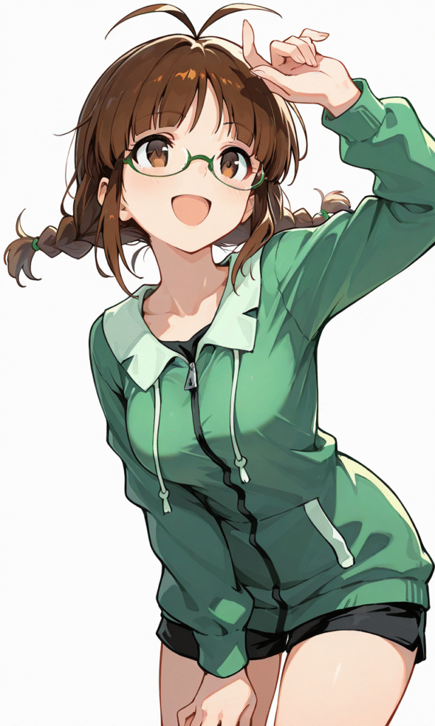 akizuki ritsuko, smile,open mouth, cowboy shot,simplebackground,white background, masterpiece,high quality, ,tokiame