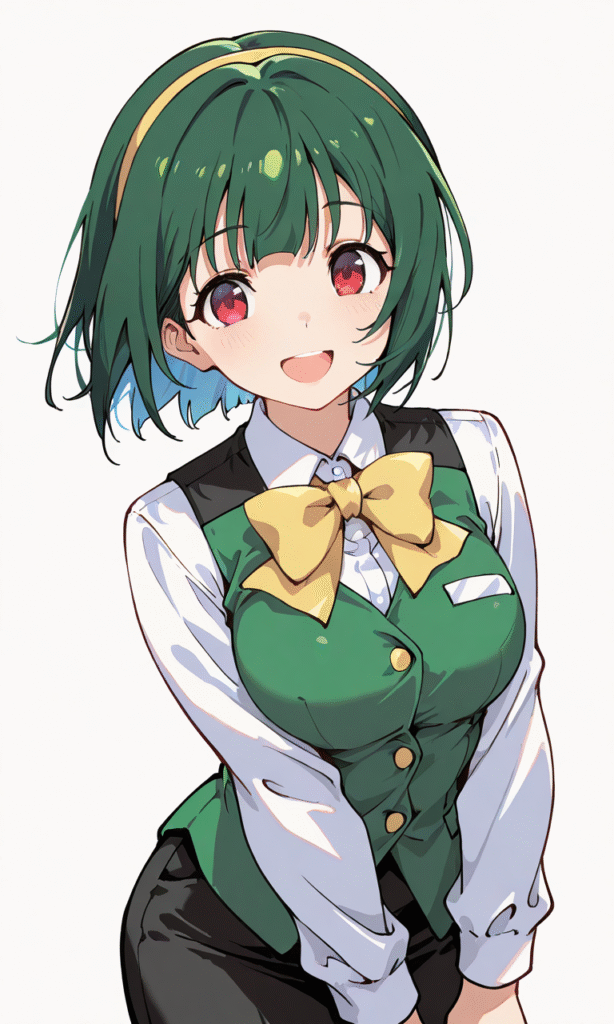 PixAI【Shiitake-Mix】shijou takane, smile,open mouth,dress shirt, sleeveless,neck ribbon, long skirt, dark red skirt, cowboy shot,simplebackground,white background, masterpiece,high quality, ,tokiame