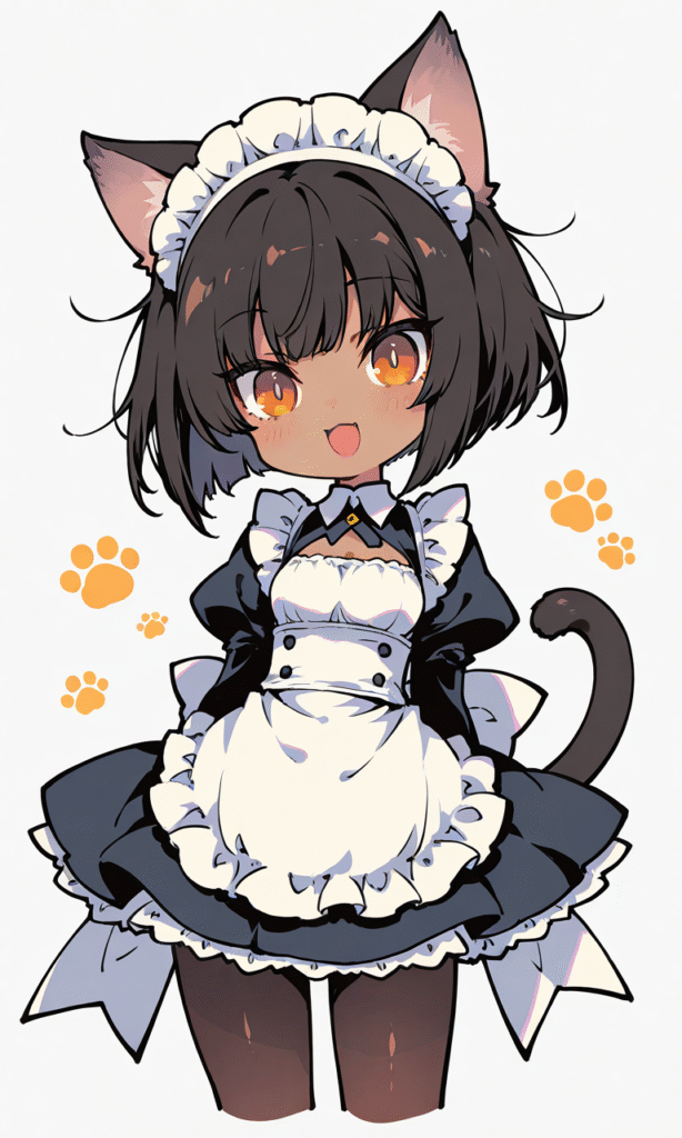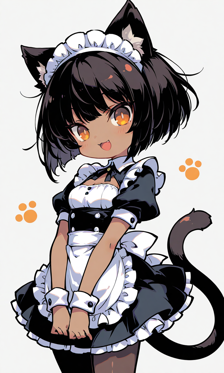 1girl, solo, cat ears, tail, bob cut, messy hair, black hair, amber eyes, tsurime, big eyes, dark skin, small breasts, maid, pantyhose, looking at viewer, smile, open mouth, cowboy shot, simple background, white background, masterpiece, high quality, high resolution, tokiame, chibi, big head, small body, large eyes, blush, simple lines, bright colors, simple colors, cute