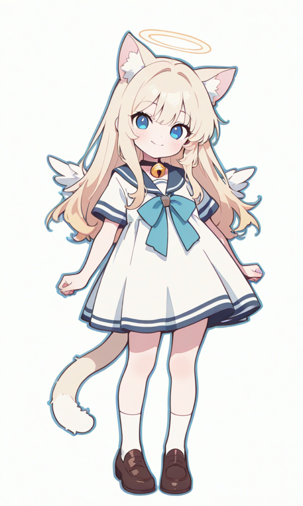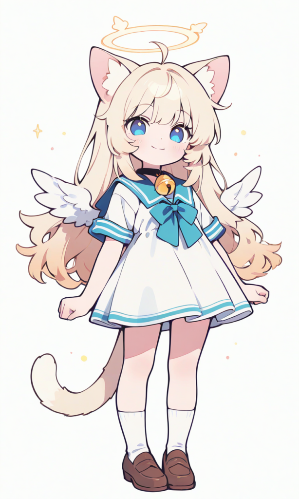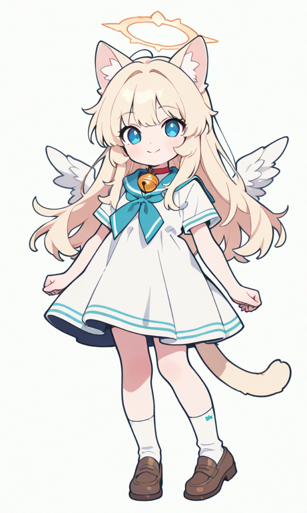PixAI【Shiitake-Mix】litre girl,solo,blonde hair,long hair,cat ears,cat tail,blue eyes,looking at viewer,halo, little wings, sailor dress, short sleeves,neck bell, smile,white socks,loafers, standing,simple background, white background, high-res, Fantasy Scene, ,{masterpiece},{anime illustration},{Deformed},{best quality}, {illustration},{thick outline},{outlined vector graphics},{2d cel anime},{flat color style},{simple coloring style},Only one person depicted, big eyes, a short limbs,