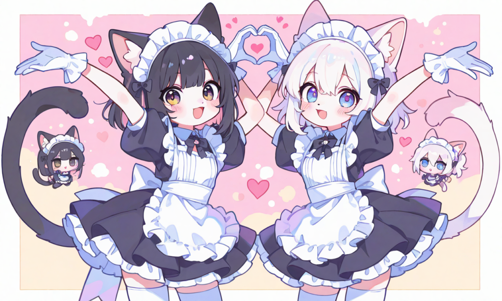 2girls, black hair, white hair, cat ears, maid, maid headdress,puffy sleeves, white gloves, white thighhighs, smile,open mouth, heart arms duo, looking at viewer, cowboy shot,masterpiece,high quality,high resolution ,high-res,Chibi furry anthro animal, oc design fursona, big eyes with unique design, creative markings, ,watercolor, sketch style, watercolor effect, pastel colors,Yuzukastyle, pastel colors,
