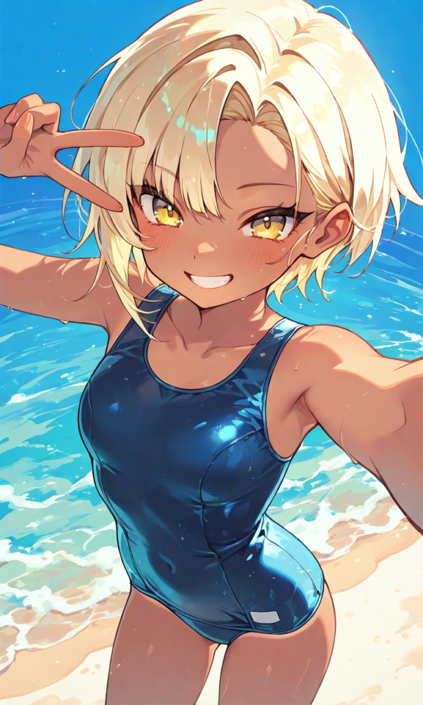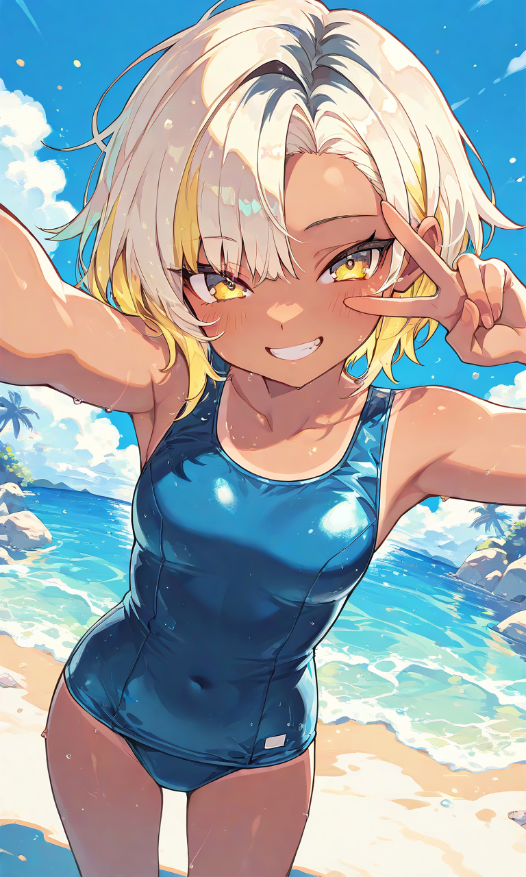 PixAI【Shiitake-Mix】girl,two-tone hair(blonde),asymmetrical bangs, short hair,yellow eyes, tsurime, Tanned skin,school swimsuit,v over eye, grin,selfie,cowboy shot,from above, blue sky, summer, masterpiece,high resolution,high quality, ,high-res,Yuzukastyle, pastel colors,