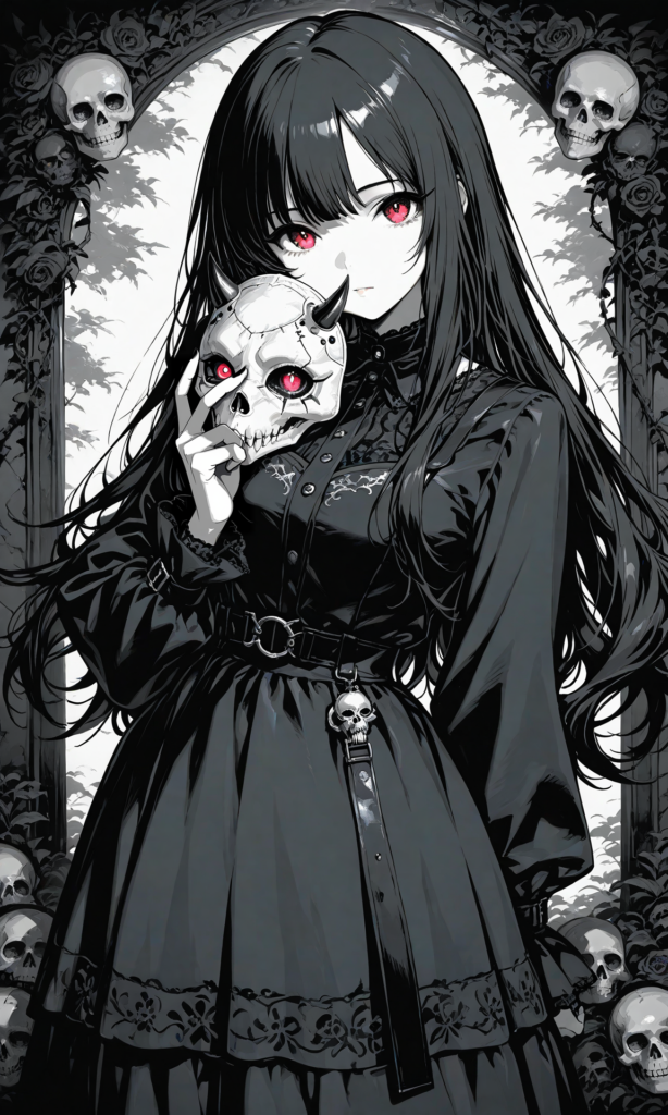 girl,black dress,black gothic dress (idolmaster), long skirt, holding mask,skull mask,black hair, long hair, red eyes,cowboy shot,looking at viewer, masterpiece,high resolution,high quality, ,monochrome, v2.0,