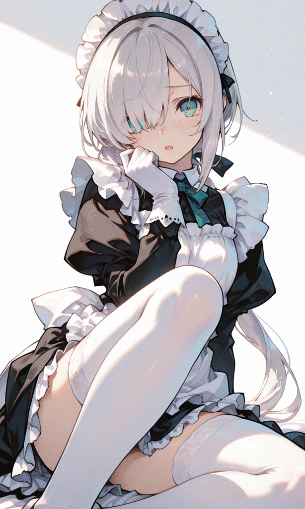 1girl, silver hair, low ponytail, hair over one eye, green eyes, open mouth, looking at viewer, shy, maid, white gloves, white thighhighs, simple background, white background, masterpiece, high quality, high resolution, hyper-detailed, high contrast, depth of field, ray tracing, best lighting, cinematic composition, beautiful face, beautiful eyes, sharp focus, (masterpiece:1.2), (best quality:1.2), (very aesthetic:1.2), (absurdres:1.2), (detailed background), tokiame