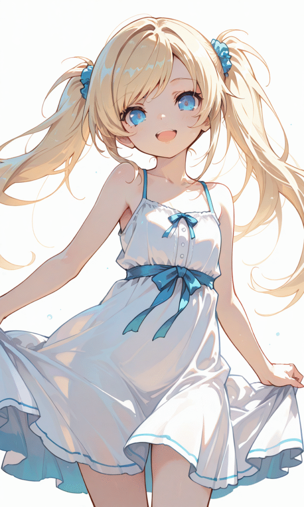 little girl, loli, blonde hair, long hair, twintail, swept bangs, blue eyes, sundress, smile, open mouth, cowboy shot, simple background, white background, masterpiece, high quality, high resolution, tokiame, hyper-detailed, high contrast, depth of field, ray tracing, best lighting, cinematic composition, beautiful face, beautiful eyes, sharp focus, (masterpiece:1.2), (best quality:1.2), (very aesthetic:1.2), (absurdres:1.2), (detailed background)