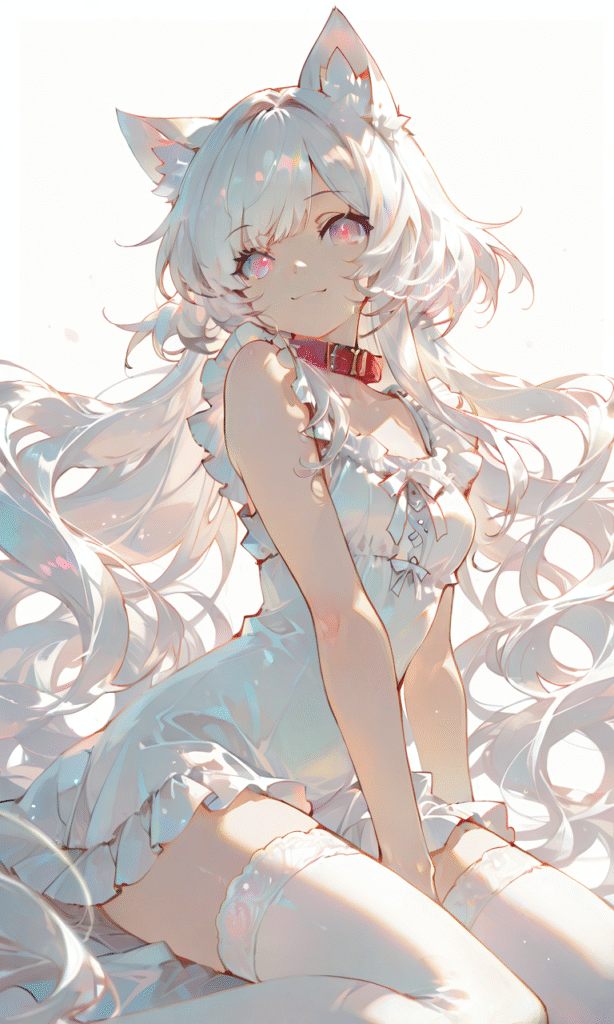 1girl, white hair, long hair, cat ears, red collar, white one-piece dress, wariza, white thighhighs, smile, cowboy shot, simple background, white background, masterpiece, high quality, high resolution, tokiame, hyper-detailed, high contrast, depth of field, ray tracing, best lighting, cinematic composition, beautiful face, beautiful eyes, sharp focus, (masterpiece:1.2), (best quality:1.2), (very aesthetic:1.2), (absurdres:1.2), (detailed background)