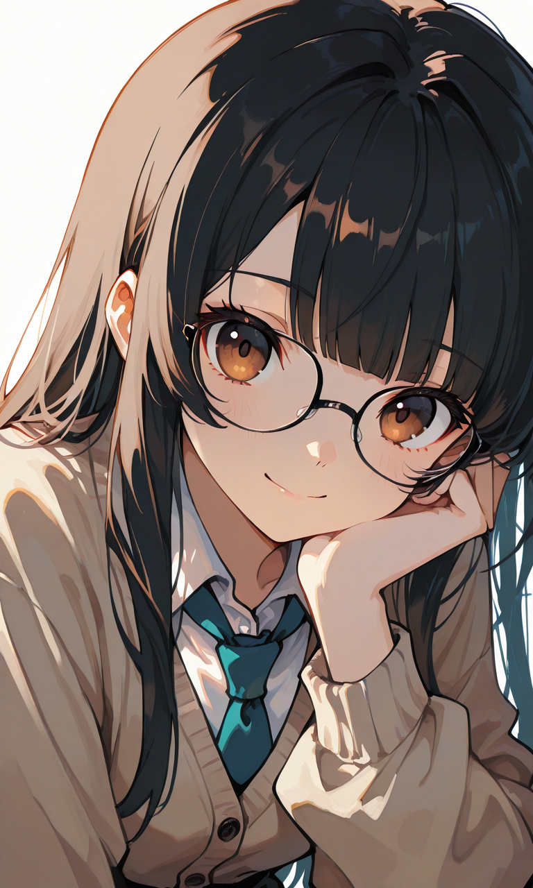 PixAI【Shiitake-Mix】1girl, black hair, long hair, straight hair, blunt bangs, glasses, brown eyes, school uniform, dress shirt, necktie, khaki cardigan, upper body, looking at viewer, smile, leaning forward, simple background, white background, masterpiece, high quality, high resolution, hyper-detailed, high contrast, depth of field, ray tracing, best lighting, cinematic composition, beautiful face, beautiful eyes, sharp focus, (masterpiece:1.2), (best quality:1.2), (very aesthetic:1.2), (absurdres:1.2), (detailed background), tokiame, EyeDetailerXL, clndl_style