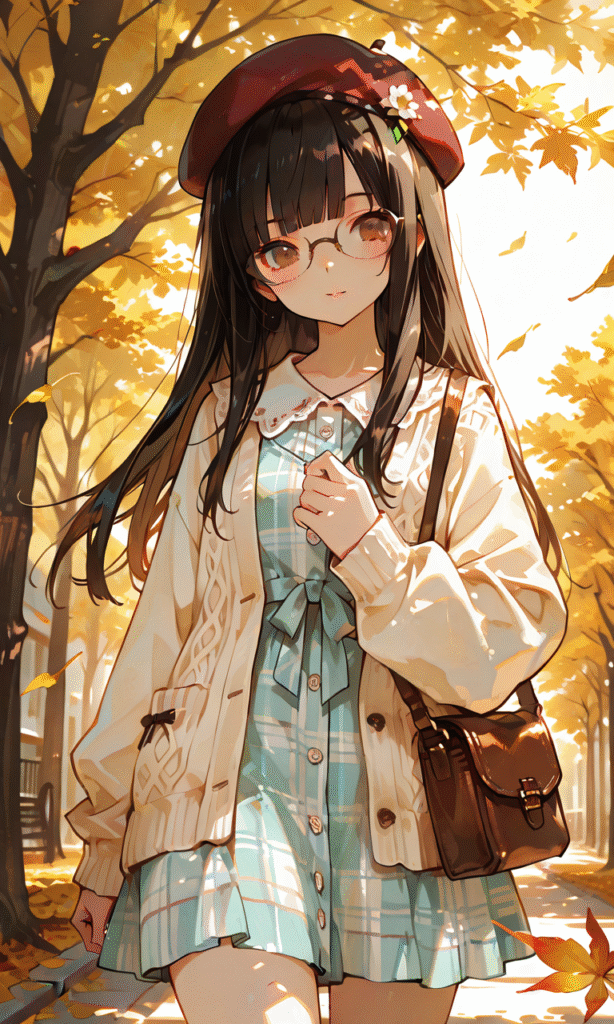 1girl, black hair, long hair, straight hair, blunt bangs, brown eyes, glasses, cowboy shot, falling leaves, soft sunlight, cream-colored cardigan, pastel plaid dress, beret, small satchel, tree, autumn, cozy, gentle atmosphere, nostalgic, seasonal charm, masterpiece, high quality, high resolution, hyper-detailed, high contrast, depth of field, ray tracing, best lighting, cinematic composition, beautiful face, beautiful eyes, sharp focus, (masterpiece:1.2), (best quality:1.2), (very aesthetic:1.2), (absurdres:1.2), detailed background, tokiame, 748cmstyle