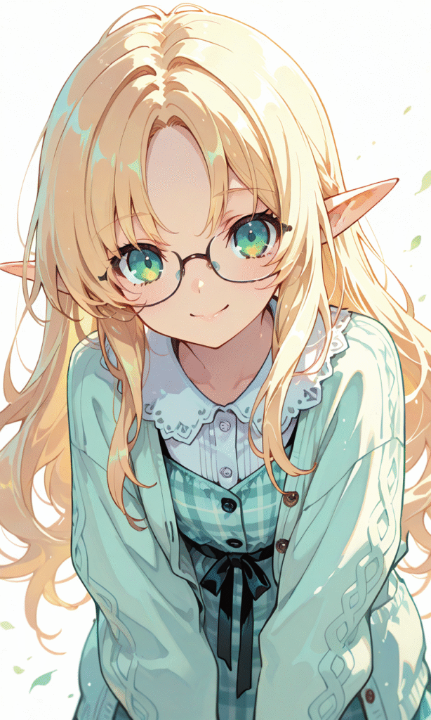 1girl, elf, solo, blonde hair, long hair, parted bangs, green eyes, big eyes, glasses, cream-colored cardigan, pastel plaid dress, smile, flat chest, looking at viewer, leaning forward, upper body, simple background, white background, masterpiece, high quality, hyper-detailed, high contrast, depth of field, ray tracing, best lighting, cinematic composition, beautiful face, beautiful eyes, sharp focus, (masterpiece:1.2), (best quality:1.2), (very aesthetic:1.2), (absurdres:1.2), (detailed background), tokiame, Fantasy Scene