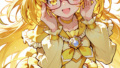 1girl, elf, solo, blonde hair, long hair, parted bangs, green eyes, big eyes, glasses, cream-colored cardigan, pastel plaid dress, smile, flat chest, looking at viewer, leaning forward, upper body, simple background, white background, masterpiece, high quality, hyper-detailed, high contrast, depth of field, ray tracing, best lighting, cinematic composition, beautiful face, beautiful eyes, sharp focus, (masterpiece:1.2), (best quality:1.2), (very aesthetic:1.2), (absurdres:1.2), (detailed background), tokiame, Fantasy Scene