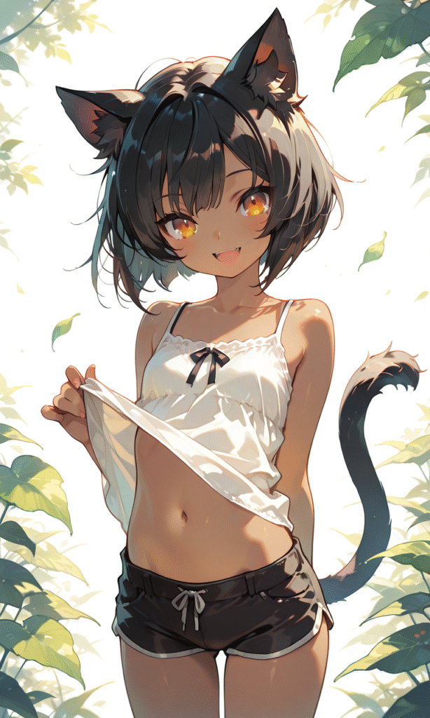 little girl, cat ears, tails, bob cut, messy hair, black hair, amber eyes, tsurime, big eyes, dark skin, small breast, camisole, short shorts, looking at viewer, smile, open mouth, cowboy shot, leaf, simple background, white background, masterpiece, high quality, high resolution, shirt lift, belly button, tokiame, Fantasy Scene, hyper-detailed, high contrast, depth of field, ray tracing, best lighting, cinematic composition, beautiful face, beautiful eyes, sharp focus, (masterpiece:1.2), (best quality:1.2), (very aesthetic:1.2), (absurdres:1.2), (detailed background)