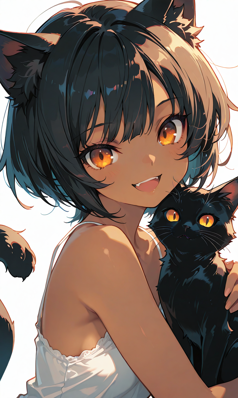 PixAI【Shiitake-Mix】1girl, cat ears, tail, bob cut, messy hair, black hair, amber eyes, tsurime, big eyes, dark skin, small breasts, camisole, looking at viewer, smile, open mouth, embracing black cat, upper body, simple background, white background, masterpiece, high quality, high resolution, hyper-detailed, high contrast, depth of field, ray tracing, best lighting, cinematic composition, beautiful face, beautiful eyes, sharp focus, (masterpiece:1.2), (best quality:1.2), (very aesthetic:1.2), (absurdres:1.2), (detailed background), tokiame