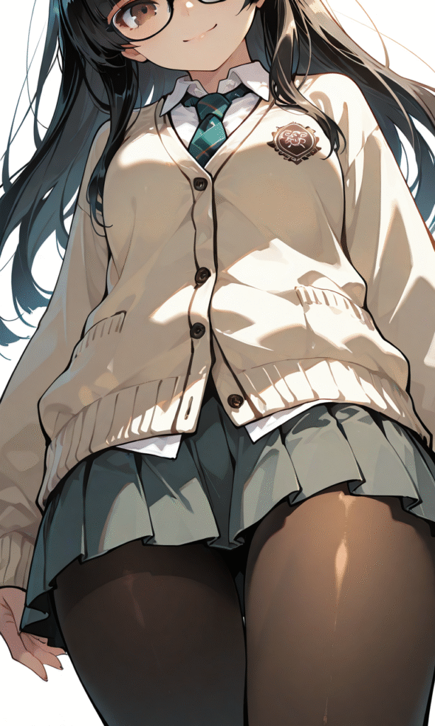 1girl, black hair, long hair, straight hair, blunt bangs, glasses, brown eyes, school uniform, dress shirt, necktie, khaki cardigan, gray miniskirt, pantyhose, thigh focus, from below, smile, dutch angle, cowboy shot, head out of frame, simple background, white background, masterpiece, high quality, high resolution, hyper-detailed, high contrast, depth of field, ray tracing, best lighting, cinematic composition, beautiful face, beautiful eyes, sharp focus, (masterpiece:1.2), (best quality:1.2), (very aesthetic:1.2), (absurdres:1.2), (detailed background), tokiame