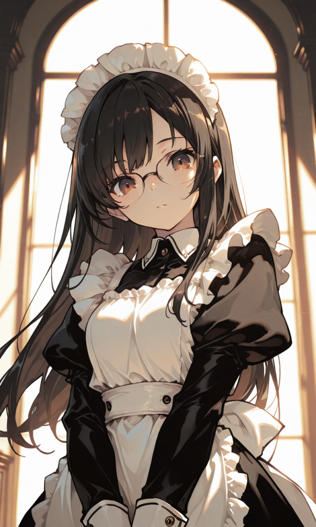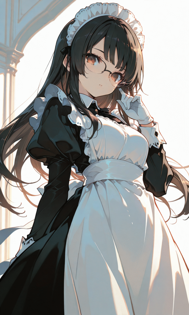 1girl, black hair, long hair, straight hair, maid, long skirt, maid headdress, white gloves, long sleeves, glasses, brown eyes, upper body, looking at viewer, from below, simple background, white background, masterpiece, high quality, high resolution, hyper-detailed, high contrast, depth of field, ray tracing, best lighting, cinematic composition, beautiful face, beautiful eyes, sharp focus, (masterpiece:1.2), (best quality:1.2), (very aesthetic:1.2), (absurdres:1.2), (detailed background), tokiame