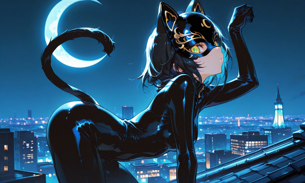 1girl, cat ears, black rubber suit, black cat mask, all fours, lucky cat pose, arm up, looking at viewer, from side, cowboy shot, night, Crescent Moon, on the roof, city lights, masterpiece, high quality, shiny skin, hyper-detailed, high contrast, depth of field, ray tracing, best lighting, cinematic composition, beautiful face, beautiful eyes, sharp focus, detailed background, tokiame