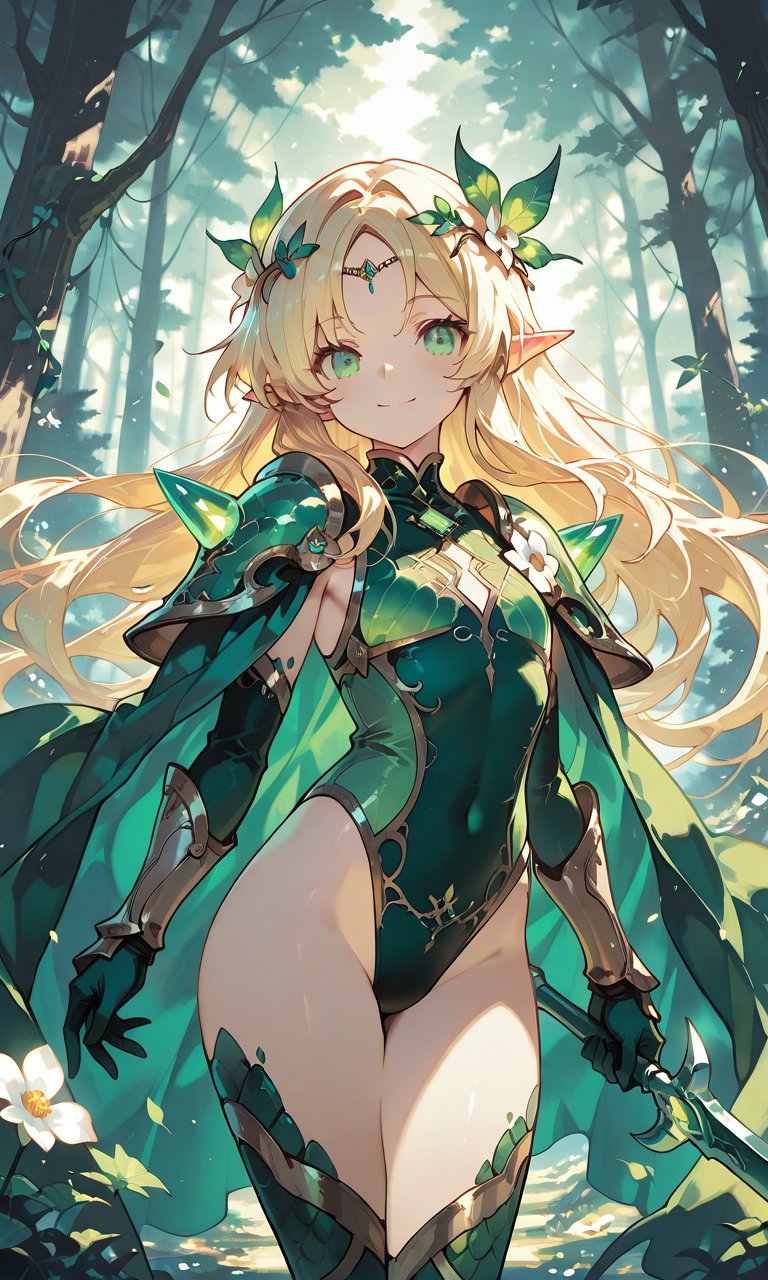 PixAI【Shiitake-Mix】girl,elf,solo,blonde hair, long hair,parted bangs,green eyes, flat chest,armored leotard, The base is a form-fitting emerald green made of flexible, high-tech fabric with subtle leaf vein patterns etched in silver. Armor plating in metallic moss green covers the shoulders, chest, shaped like overlapping leaves or dragon scales.The neckline is high with a leaf-shaped cutout at the chest, and the back features a flowing cape of translucent green mesh resembling vines or mist. Her gauntlets and thigh guards are lightweight but reinforced, with glowing jade accents and vine-like engravings. She wears a visor or circlet with a glowing emerald gem at the center, and her weapon is a twin-bladed glaive shaped like a blooming flower. smile,cowboy shot,forest, masterpiece,high quality,high resolution,hyper-detailed, high contrast, depth of field, ray tracing, best lighting, cinematic composition, beautiful face, beautiful eyes, sharp focus, (masterpiece:1.2), (best quality:1.2), (very aesthetic:1.2), (absurdres:1.2), (detailed background),tokiame, Fantasy Scene,