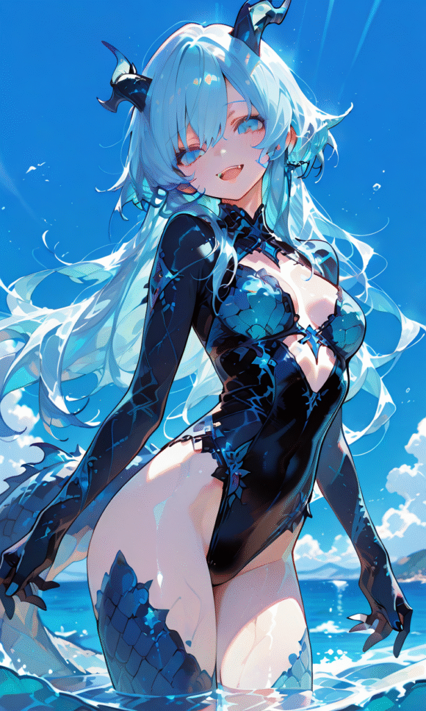 dragon girl, blue scales suit,blue hair,scales arms scales legs,smile,open mouth, cowboy shot,water, simplebackground,blue background, masterpiece,high quality, high resolution,shiny skin, shiny,hyper-detailed, high contrast, depth of field, ray tracing, best lighting, cinematic composition, beautiful face, beautiful eyes, sharp focus, (masterpiece:1.2), (best quality:1.2), (very aesthetic:1.2), (absurdres:1.2), (detailed background),tokiame, Fantasy Scene, ,748cmstyle
