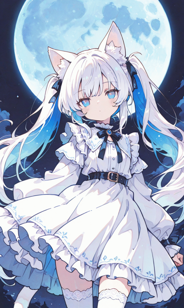 little girl,loli,white hair, long hair, twintail,blue eyes, jitome, white Gothic dress,white thighhighs, cat ears, blue moon, full moon, cowboy shot,masterpiece,high quality, high resolution,hyper-detailed, high contrast, depth of field, ray tracing, best lighting, cinematic composition, beautiful face, beautiful eyes, sharp focus, (masterpiece:1.2), (best quality:1.2), (very aesthetic:1.2), (absurdres:1.2), (detailed background),tokiame, Fantasy Scene, , Flatline, Flat vector illustration, Vivid colors, white thick outline, outline, Blue Inner hair color, watercolor, soft light,