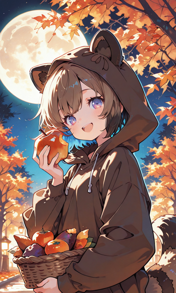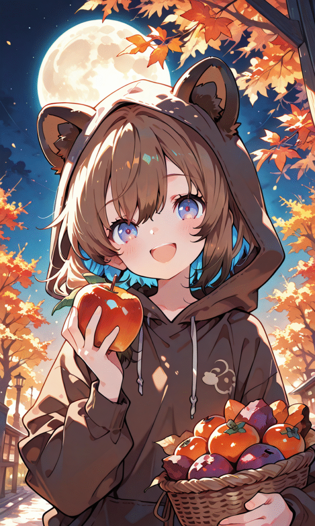 little girl,loli,(((raccoon dog ears hoodie))),((ears hood)),brown hoodie, smile,open mouth,holding basket(apple,sweet potato,persimmon), upper body, autumn,night,full moon, masterpiece,high quality, high resolution,tokiame,cinematic lighting , cinematic angle, soft light , color detail, backlighting, Depth of field, long exposure, light steps, intricate colors, vibrant colors,((4k,8k,Ultra HD)),((Masterpiece :1.2)),((Best quality :1.2)),((Detailed :1.5)),((Detailed background :1.5)),hyper-detailed, high contrast, depth of field, ray tracing, best lighting, cinematic composition, beautiful face, beautiful eyes, sharp focus, (masterpiece:1.2), (best quality:1.2), (very aesthetic:1.2), (absurdres:1.2), (detailed background), Fantasy Scene, , Flatline, Flat vector illustration, Vivid colors, white thick outline, outline, Blue Inner hair color, watercolor, soft light, ,(detailed_hands:1.5)
