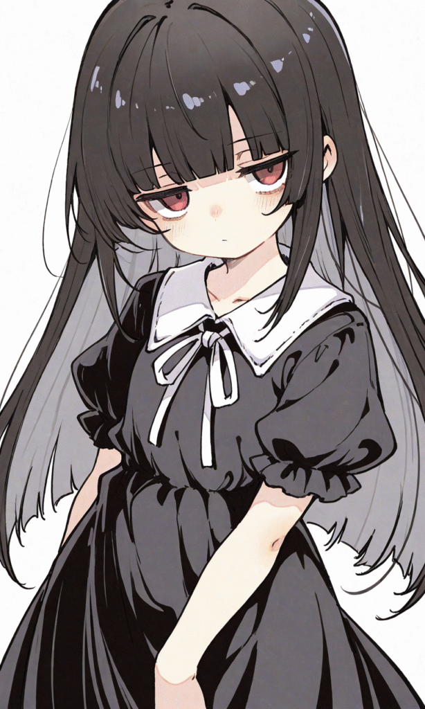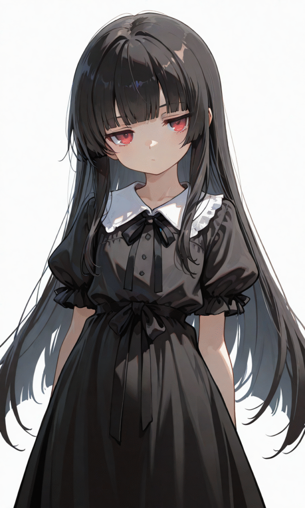little girl,Loli,solo,black hair,long hair,straight hair,blunt bangs,red eyes,jitome,black sundress,puffy short sleeves,cowboy shot,simplebackground,white background, masterpiece,high quality, ,tokiame,hyper-detailed, high contrast, depth of field, ray tracing, best lighting, cinematic composition, beautiful face, beautiful eyes, sharp focus, (masterpiece:1.2), (best quality:1.2), (very aesthetic:1.2), (absurdres:1.2), (detailed background),
