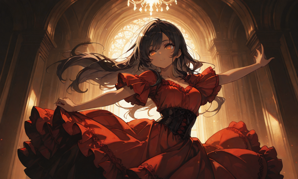 Carmen,girl,black hair,long hair,amber eyes,dark skin,red frilled dress,dancing,hyper-detailed, high contrast, depth of field, ray tracing, best lighting, cinematic composition, beautiful face, beautiful eyes, sharp focus, (masterpiece:1.2), (best quality:1.2), (very aesthetic:1.2), (absurdres:1.2), (detailed background),tokiame