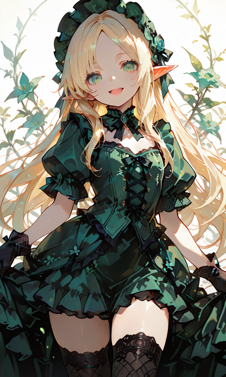 PixAI【Shiitake-Mix】girl,elf,solo,blonde hair, long hair,parted bangs,green eyes, flat chest,green Gothic Lolita,puffy short sleeves,high-low skirt, gloves, lace thighhighs, smile,open mouth, cowboy shot,simplebackground,white background, masterpiece,high quality, high resolution,tokiame, Fantasy Scene, ,hyper-detailed, high contrast, depth of field, ray tracing, best lighting, cinematic composition, beautiful face, beautiful eyes, sharp focus, (masterpiece:1.2), (best quality:1.2), (very aesthetic:1.2), (absurdres:1.2), (detailed background),,748cmstyle