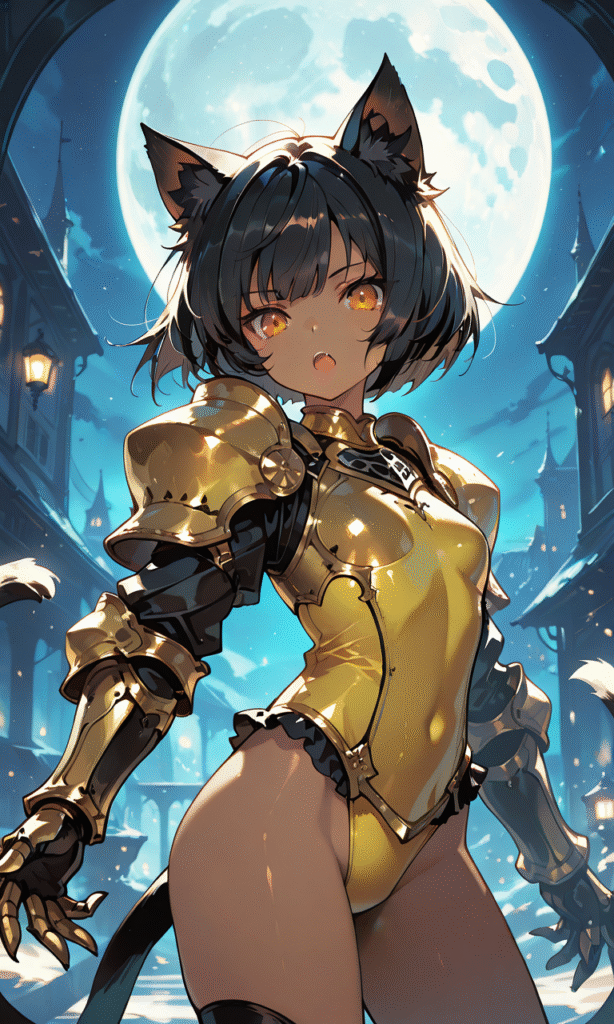 little girl,cat ears, tails,bob cut, messy hair,black hair, amber eyes,tsurime,big eyes, dark skin,small breast, armored leotard, yellow leotard,breast armor, gauntlet,Iron Claw,looking at viewer, serious, open mouth, cowboy shot,moon night, masterpiece,high quality,hyper-detailed, high contrast, depth of field, ray tracing, best lighting, cinematic composition, beautiful face, beautiful eyes, sharp focus, (masterpiece:1.2), (best quality:1.2), (very aesthetic:1.2), (absurdres:1.2), (detailed background),tokiame, Fantasy Scene,