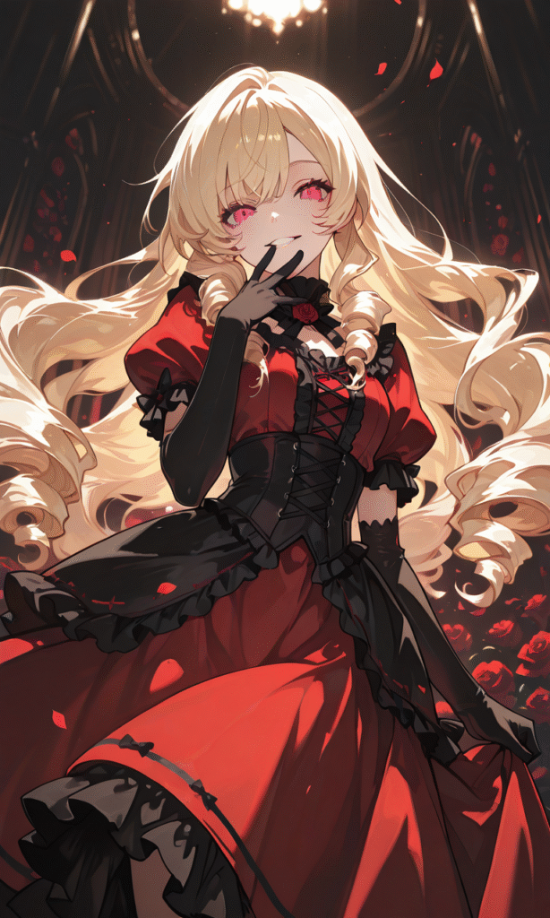 girl,blonde hair, ((long hair)),twin drills,red Gothic Lolita,no hair ornament, puffy short sleeves,long skirt, elbow gloves, grin,open mouth, hand_on_own_mouth,from below, dutch angle, cowboy shot,rose background, masterpiece,high quality, はい,hyper-detailed, high contrast, depth of field, ray tracing, best lighting, cinematic composition, beautiful face, beautiful eyes, sharp focus, (masterpiece:1.2), (best quality:1.2), (very aesthetic:1.2), (absurdres:1.2), (detailed background),tokiame,hyper-detailed, high contrast, depth of field, ray tracing, best lighting, cinematic composition, beautiful face, beautiful eyes, sharp focus, (masterpiece:1.2), (best quality:1.2), (very aesthetic:1.2), (absurdres:1.2), (detailed background),solo, beautiful_eyes, focus_face, aegyo_sal, soft_lips, perfect_skin, beautiful_face, Korean_style