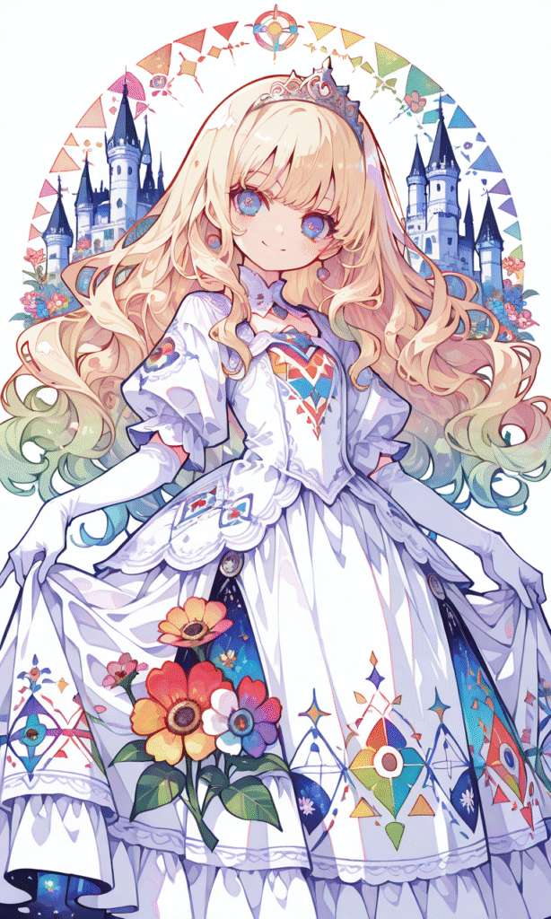 little girl,loli,blonde hair, long hair, wavy hair, princess dress,pearl white,dress,elbow gloves, long skirt,tiara,smile,cowboy shot,castle,night sky, masterpiece,high quality, high resolution ,minimalistic line logo, tessellated geometrical design, symmetrical, vectorized, white background, digital style,colored pencil, colorful flowers,tokiame