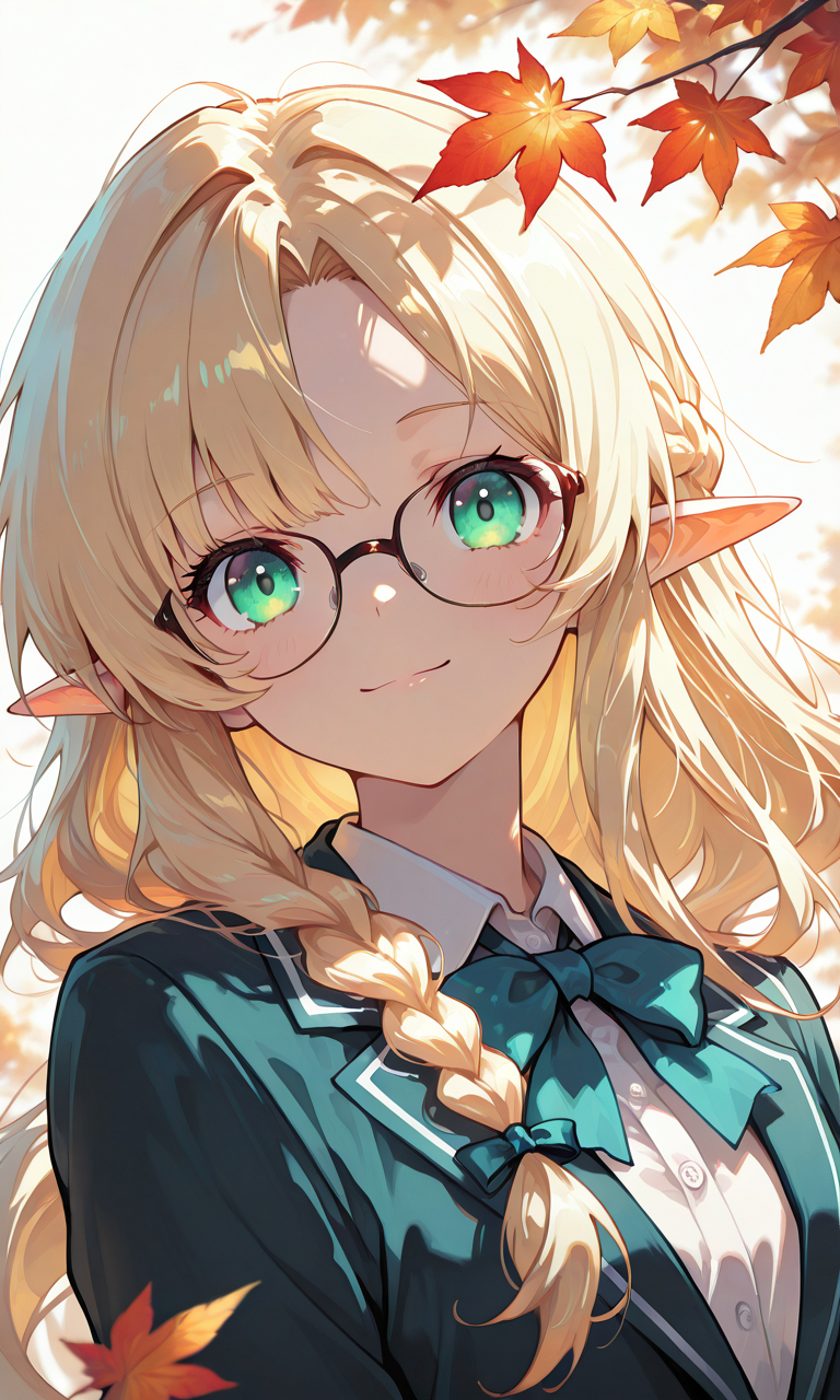 PixAI【Shiitake-Mix】girl,elf,solo,blonde hair, long hair,parted bangs,single braid, green eyes,glasses,upturned eyes,flat chest,school uniform, blazer, smile,dutch angle, autumn,upper body, simplebackground,white background, masterpiece,high quality, high resolution,hyper-detailed, high contrast, depth of field, ray tracing, best lighting, cinematic composition, beautiful face, beautiful eyes, sharp focus, (masterpiece:1.2), (best quality:1.2), (very aesthetic:1.2), (absurdres:1.2), (detailed background),tokiame,hyper-detailed, high contrast, depth of field, ray tracing, best lighting, cinematic composition, beautiful face, beautiful eyes, sharp focus, (masterpiece:1.2), (best quality:1.2), (very aesthetic:1.2), (absurdres:1.2), (detailed background), Fantasy Scene, ,EyeDetailerXL